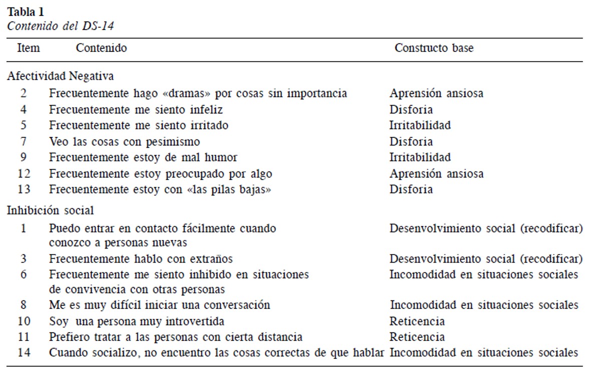 En el idioma español también se han analizado las propiedades psicométricas del cuestionario DS-14, aunque solo en el estudio efectuado por Montero et al. (2017), a partir de una muestra compuesta por 890 participantes, donde se incluyeron personas sanas (n = 430), pacientes con cardiopatía isquémica (n = 230) y oncológicos (n = 230). Los resultados de los análisis factoriales exploratorios y confirmatorios realizados demostraron una estructura compuesta por dos dimensiones acorde a la original; se obtuvieron, además, asociaciones positivas con medidas de agotamiento vital, malestar emocional, ansiedad, depresión e ira interna, y negativas con apoyo social, satisfacción con la vida y extroversión, así como coeficientes alfa de Cronbach satisfactorios (entre .81 y .90 para las tres muestras).