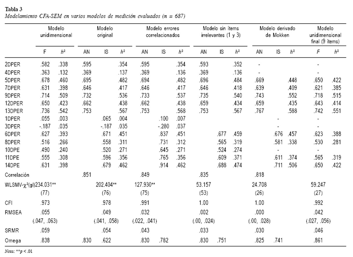 El presente estudio consideró usar niveles más estrictos de evaluación del modelamiento: cargas factoriales iguales o mayores a .50 e índices de ajuste con CFI ≥ .97, RMSEA ≤ .04, y SRMR ≤ .04. Para la estimación de consistencia interna se calculó el coeficiente omega (ω), un coeficiente de confiabilidad más preciso que alfa de Cronbach (α) cuando no se cumplen los presupuestos de este (Dunn, Baguley, & Brunsden, 2014).