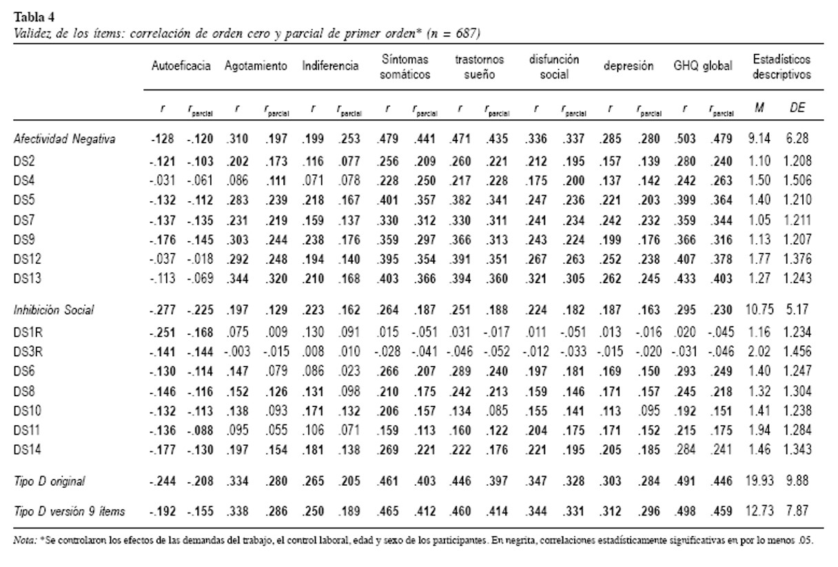 Posteriormente, se utilizaron correlaciones de orden cero para verificar la validez de los ítems del DS-14 con criterios externos de salud mental (dimensiones de burnout y salud mental), y para controlar los efectos de estresores laborales y otras variables sociodemográficas relevantes, se estimó el coeficente de segundo orden o de corelación parcial, una opción metodológica para descartar efectos espúreos (Aneshensel, 2012). La identificacion de correlaciones de orden cero y parciales y su clasificación de bajas, moderadas o altas, estuvo basada en el criterio empírico propuesto por Bosco, Aguinis, Singh, Field y Pierce (2015).