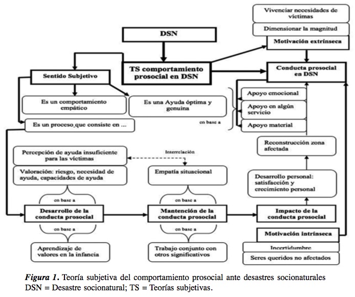 Dentro de estas líneas investigativas, la respuesta de la sociedad civil ante los afectados del desastre podría comprenderse como comportamiento prosocial entendido como «las conductas llevadas a cabo para ayudar o beneficiar a otros» (Sánchez-Queija, Oliva, & Parra., 2006, p. 260), que puede o no ser altruista, abarcando una alta gama de actividades como comportamientos de rescate, asistencia, donación, apoyo social y voluntariado (Richaud, Mesurado, & Cortada, 2012). Según Martí-Vilar, Corell-García y Merino-Soto (2019) estas acciones deben comprenderse independiente del tipo de motivación que guíe su actuar o del efecto que se produzca en otra persona en contraste al altruismo, el cual «supone cierto coste para quien las realiza y lo hace voluntariamente, con intención de lograr beneficios para otros y sin anticipar ninguna recompensa» (Guijo, 2002, p. 31).