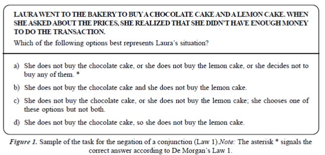 Another option offered was the so-called scope bias, associated with the processing bias proposed by Khemlani et al. (2012). This deviation is observed in the case of compound negation, according to which individuals tend to limit their interpretation to only one of the atomic propositions (small scope) and not to the compound proposition in its entirety (large scope) (Khemlani et al., 2012; Macbeth et al., 2013). To illustrate it better, let’s check the example in Figure 1, where Laura realizes that she does not have enough money to buy a chocolate cake and a lemon cake, as intended. Finding the appropriate logical equivalent in this task requires to be able to deny both atomic propositions jointly: Laura does not buy the chocolate cake, or she does not buy the lemon cake, or she does not buy any of the two (inclusive disjunction: Figure 1, option a; Figure 2, option c). Despite this, most individuals tend to choose the option in which the propositions are denied but only separately; that is, Laura does not buy the chocolate cake, or does not buy the lemon cake; she chooses one but not both (exclusive disjunction: Figure 1, option c; Figure 2, option b).