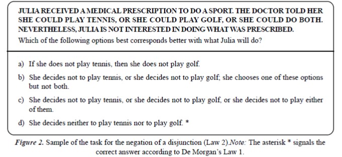 In this way, the purpose of this study is to analyze the propositional reasoning of both laws in relation to the natural language of people. In particular, it aims to test the aforementioned predictions. It should be borne in mind, however, that such predictions will only make sense in a theory that considers the representation of mental models as a general mechanism of reasoning. This hardly happens in the case of theories based on logicist assumptions (Khemlani et al., 2012).