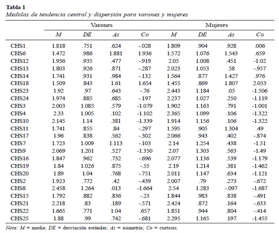 Los valores de las medidas de dispersión de cada ítem del CHS se encuentran en el rango de ±2, por tanto, la variación de los datos hace viable la realización de un análisis factorial (Gravetter & Wallnau, 2013; Pérez & Medrano, 2010).
