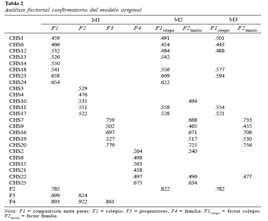 En la segunda fase se realizó una revisión de la asociación de cada ítem con el contenido teórico de la subescala y considerando los resultados de la primera fase. Se logró identificar que CHS3, CHS4, CHS8, CHS14, CHS15 y CHS21 en aspectos de redacción hacen referencia a eventos cotidianos, pero que no están orientados a una subescala específica, lo que puede originar cargas factoriales cruzadas y complejidad factorial. Además, considerando las correlaciones interfactoriales de M1, se reorganizaron los ítems en una estructura parsimoniosa de dos factores oblicuos (M2) que hace referencia a eventos en el contexto del colegio (F1) y la familia (F2).
