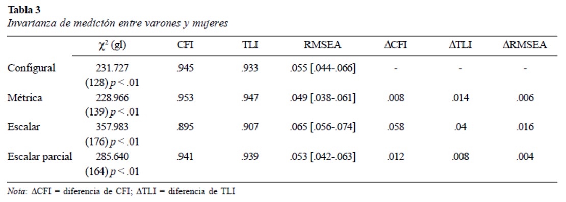 Fue evaluada la invarianza de medición de M3. Se comprobó la línea base (invarianza configural). Luego se agregaron restricciones de las cargas factoriales (invarianza métrica) y las variaciones del CFI, TLI y RMSEA fueron dentro del límite recomendado. Al agregar la restricción de igualdad de interceptos (invarianza escalar), los valores EPC asociados a los ítems 9, 11, 20 y 23 fueron > .20; es así que, relajando estas restricciones (invarianza parcial), los valores de las variaciones de los índices de ajuste fueron satisfactorios.
