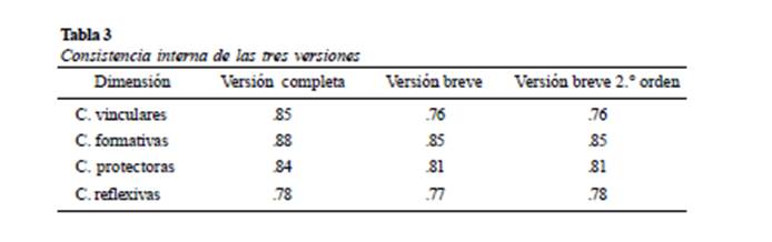 Para analizar la consistencia interna, teniendo en cuenta la falta de normalidad de los datos, se calculó el coeficiente Omega para las tres versiones analizadas, verificándose índices adecuados en todas las dimensiones (ver Tabla 3). La versión propuesta, es decir, abreviada de segundo orden, obtuvo un valor de ω = .92 para la escala total y valores adecuados para cada una de las dimensiones (ver Tabla 3).