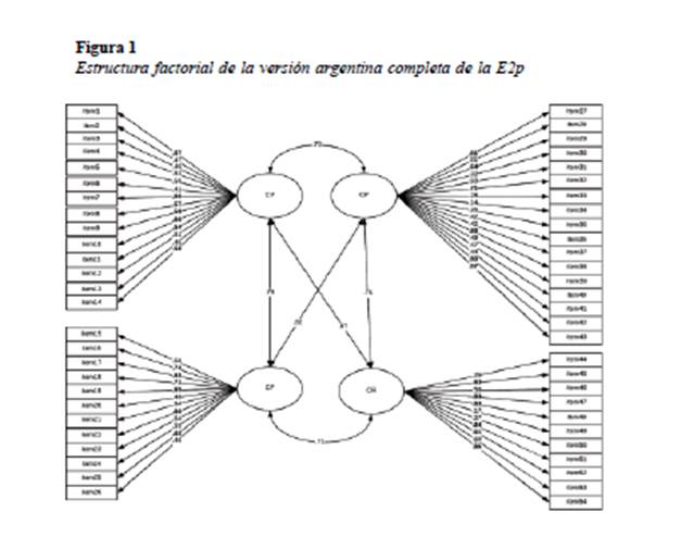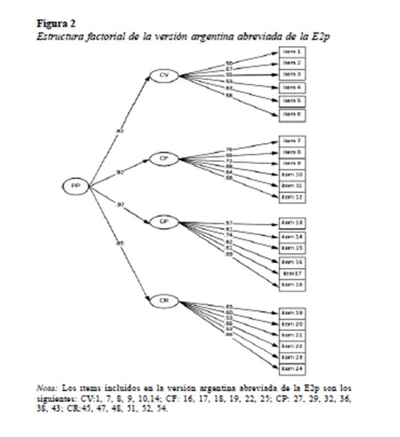 Para analizar la estructura factorial de la E2p, se llevaron a cabo tres AFC, donde los modelos puestos a prueba respondían a lo siguiente: (a) la versión completa de la E2p adaptada al contexto argentino (54 ítems), (b) la versión abreviada de la misma (24 ítems) y (c) un modelo de segundo orden de versión abreviada (24 ítems). Para establecer estos tres modelos, se realizó primero un AFC de la versión completa de la escala de acuerdo al modelo propuesto por los autores (Gómez & Muñoz, 2014). Luego, se seleccionaron solo 6 ítems por factor según los reactivos que saturaban más alto en cada dimensión y que representaban más adecuadamente los diferentes aspectos del constructo, siguiendo de este modo criterios tanto empíricos como teóricos. Con este procedimiento se eliminaron 30 de los 54 ítems originales quedando un total de 24 reactivos (señalados en negrita en la Figura 1) que constituyeron la versión breve de la prueba.
