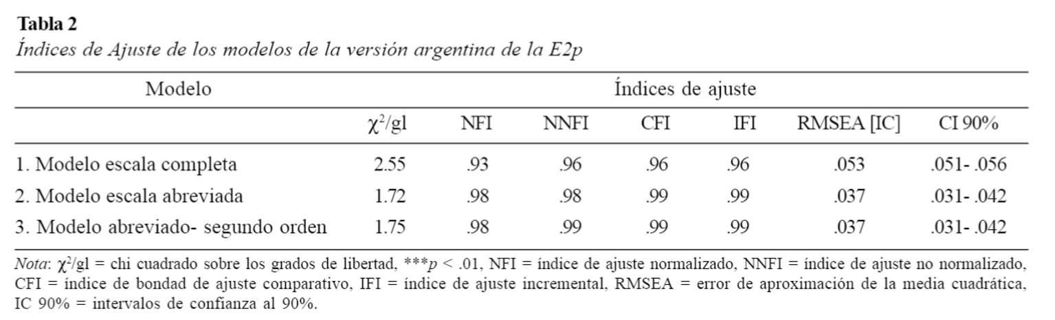 Hasta el momento no se ha publicado ninguna versión abreviada de la E2p, tampoco existen trabajos respecto a su funcionamiento psicométrico en la población argentina, tarea a la que está abocada este estudio.