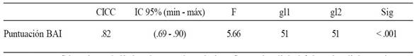 Con respecto a la estabilidad temporal del BAI, la Tabla 1 refleja que el coeficiente de correlación intraclase ha sido aceptable, indicando una buena confiabilidad.