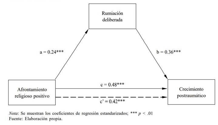 Resultados: los principales resultados indicaron que el afrontamiento religioso positivo y la rumiación deliberada predijeron el CPT. La rumiación deliberada media parcialmente entre el afrontamiento religioso positivo y el CPT.