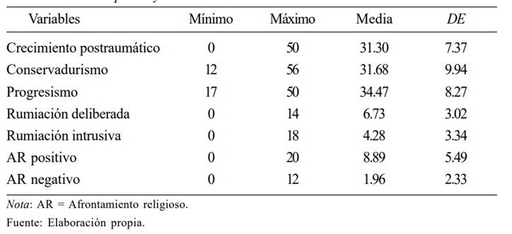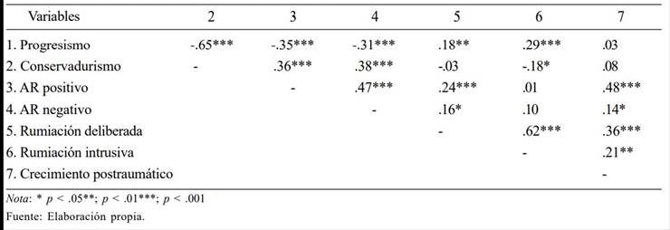 En general, se observa que el CPT presenta su relación más fuerte con el afrontamiento religioso positivo (r = -.48; p < .001) y luego con la rumiación deliberada (r = -.36; p < .001), la rumiación intrusiva (r = -.21; p < .01) y el afrontamiento religioso negativo (r = -.14; p < .05). No se observa una relación significativa de progresismo y conservadurismo con el CPT.