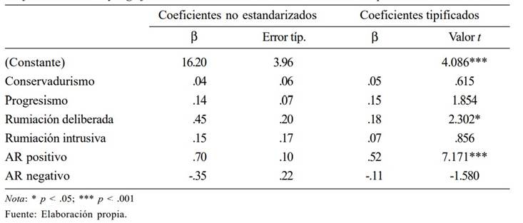 Para evaluar la relación y el efecto de la ideología política progresista, ideología política conservadora, afrontamientos religioso positivo, afrontamiento religioso negativo, rumiación deliberada e intrusiva sobre el CPT, se llevó a cabo un análisis de regresión lineal múltiple (RLM), como se observa en la Tabla 3.