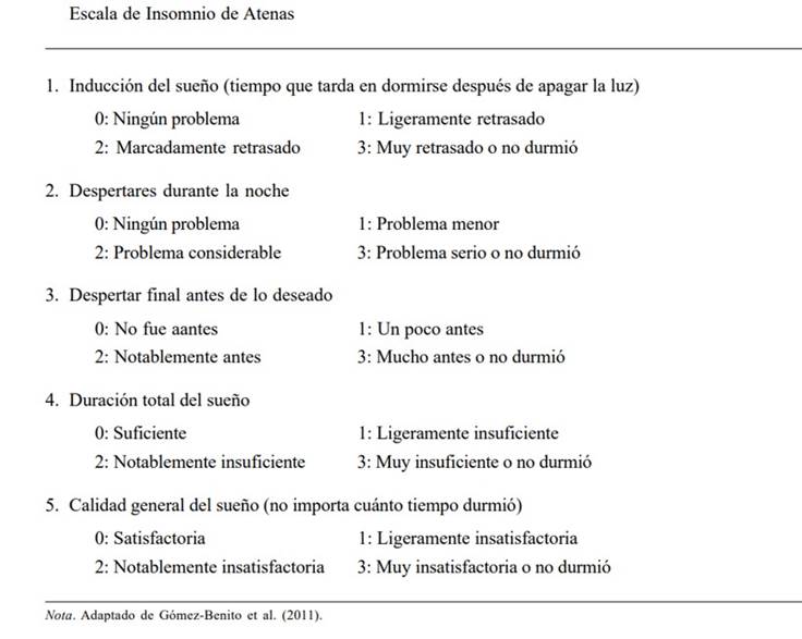 Escala de Insomnio de Atenas. Fue desarrollado por Soldatos et al. (2000) para evaluar el insomnio según los criterios del CIE-10. La escala tiene dos versiones, una de 8 ítems y otra de 5 ítems. En este estudio se utilizó la versión en español de 5 ítems (Gómez-Benito et al., 2011), donde aquellos ítems evalúan la inducción del sueño, despertares durante la noche, despertares antes de lo deseado, duración y calidad del sueño. El sistema de respuesta es de tipo Likert, el cual se encuentra en un rango de 0 (ausencia del problema) a 3 (problema serio) y la puntuación general de la escala varía de 0 a 15 puntos. Los encuestados responden en función si han experimentado aquellas dificultades al menos tres veces por semana durante el último mes. La versión en español presenta un adecuado coeficiente alfa de .79 y evidencia de validez basada en la relación con otras variables, específicamente, con la sintomatología depresiva (r = .46), ansiedad (r = .42) y angustia psicológica (r = .44). Por otro lado, se realizó un estudio piloto con 20 adultos peruanos residentes en Lima Metropolitana con la finalidad de examinar la comprensión de los ítems en la población de estudio. Todos los participantes indicaron que no tuvieron dificultad para comprender los ítems, ni tampoco preguntas o sugerencias. Se adjunta la escala (ver Anexo).