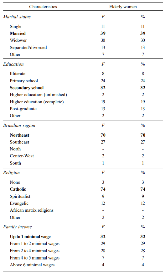 The sample included 100 elderly women from 13 Brazilian states, more specifically, Piauí (41%), Rio de Janeiro (22%), Ceará (18%), Maranhão (5%), São Paulo (4%), Pernambuco (4%), Rio Grande do Norte (1%), Distrito Federal (1%), Espírito Santo (1%), Goiás (1%), Paraíba (1%) and Rio Grande do Sul (1%). The participants’ ages varied from 60 to 83 years old (M = 69.24, SD = 6.58). Most of them were married (39%) and had a secondary level of education (32%) (see Table 1).