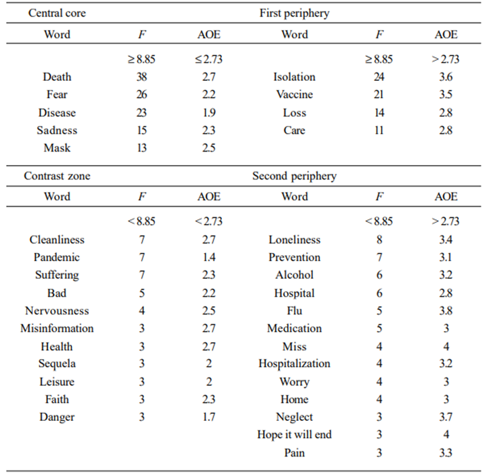 Table 2 left upper part presents the categories that compose the first quadrant, which corresponds to the core elements or the central core of the representation. The first quadrant is composed of the words with high frequency (F) and low AOE, i.e., words promptly evoked after the presentation of the stimulus word and used by a great number of participants. The first quadrant of Table 2, where the central core is, consisted of recurring evocations (ƒ ≥ 8.85) with high hierarchy (AOE ≤ 2.73), where the expressions «death», «fear», «disease», «sadness», and «mask» are highlighted as core elements of the social representations of COVID-19. Those elements represent what was more consensual among the participants and, therefore, more strongly shared among them.