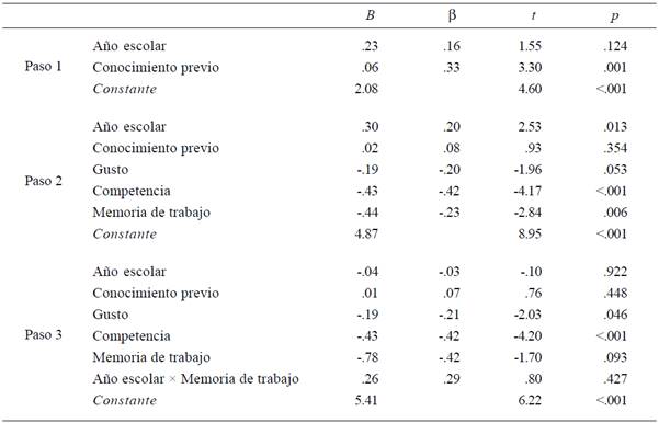 Con el propósito de conocer el valor explicativo de las variables predictoras, se efectuó un análisis de regresión jerárquica identificando: (a) la proporción de varianza del desempeño en matemáticas que las FE y las actitudes hacia las matemáticas predicen más allá del conocimiento previo, y (b) el grado en que la relación de las FE con el desempeño en matemática varía entre 1.er y 2.do año. Se incluyeron como predictoras aquellas variables que mostraron una correlación significativa con el desempeño final en matemáticas. En el primer paso del modelo se incorporó el año escolar (1.er año = 1; 2.do año = 2) y el conocimiento matemático previo; en el segundo, se añadieron aquellas variables que mostraron una correlación significativa con el desempeño en matemáticas y, con el fin de contrastar si el valor explicativo de la MT sobre el desempeño en matemáticas varía entre estudiantes de 1.er y 2.do año, en el tercer paso se incluyó una variable creada para representar la interacción entre el año escolar y la MT. Esta variable de interacción representa el producto entre la variable año escolar (1 = 1.er año; 2 = 2.do año) y las puntuaciones en MT (Warner, 2012).
