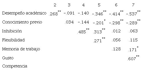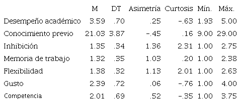 En primer lugar, se analizó la distribución de las puntuaciones en cada una de las variables y sus relaciones. En la Tabla 1 se muestran los estadísticos descriptivos de las variables de estudio: desempeño académico, conocimiento previo, inhibición, memoria de trabajo, flexibilidad cognitiva, gusto por las matemáticas y competencia percibida.