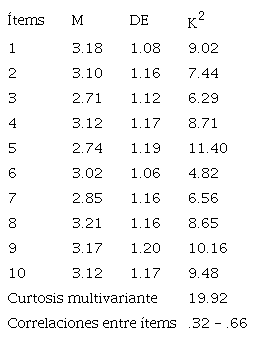 La Tabla 2 indica estadísticos descriptivos sobre los ítems, la media presenta valores que oscilan entre 2.71 a 3.21, la desviación oscila de 1.06 a 1.20. Los valores de asimetría y curtosis conjunta de K2 > 5.99 reflejan el incumplimiento del primer supuesto correspondiente a normalidad univariante, asimismo el índice de curtosis multivariante muestra como valor el 19.92 < 70, probando el cumplimiento del segundo supuesto referente a normalidad multivariante y las correlaciones entre ítems muestran valores de .32 a .66 < .90 confirmando el supuesto de ausencia de multicolinealidad entre los ítems. Esto permite la aplicación del análisis factorial confirmatorio, calculándose los coeficientes de la estructura a través del método de máxima verosimilitud.