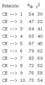 En la Tabla 3 se evidencian los coeficientes estandarizados de las cargas factoriales aik y los coeficientes de correlación múltiple al cuadrado r2 de la escala de cansancio emocional que presenta una estructura unidimensional, observándose valores de aik entre .47 a .83 y una proporción de variabilidad del ítem explicada por el factor cansancio emocional de 22% al 69%, como se representa gráficamente en la Figura 1.
