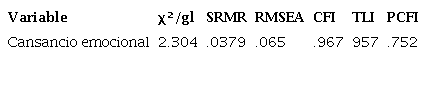La Tabla 4 indica índices de ajuste sobre la escala de cansancio emocional, hallándose valores que indican un buen ajuste global, como en la razón de verosimilitud c2/gl = 2.304 < 3 (Carmines & McIver, 1981), SRMR = .0379 < .08 (Hu & Bentler, 1999), RMSEA = .065 < .08; en índices de ajuste comparativo CFI = .967 > .95 y TLI = .957 > .95 (Bentler, 1990) y en el índice de ajuste parsimonioso PCFI = .752 > .70 (James et al., 1982) para el modelo unifactorial con 10 ítems.