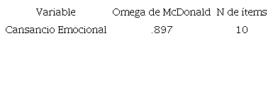 En la Tabla 5 se explica el índice de confiabilidad omega de Mc Donald. Permite determinar la consistencia interna con un modelo de medición congenérico, se asume que cada ítem mide la misma variable latente (Raykov, 1997) y es un método recomendado cuando se trabaja con cargas factoriales (Ventura-León, 2018). Además, los ítems ostentan cargas factoriales con valores distintos por cada ítem, obteniéndose un valor de .897 evidenciando una buena precisión de la escala para medir el cansancio emocional.
