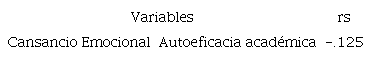 En la Tabla 6 se revela la existencia de una relación inversa de magnitud pequeña (.10 £ rs < .30) entre cansancio emocional y la autoeficacia académica.
