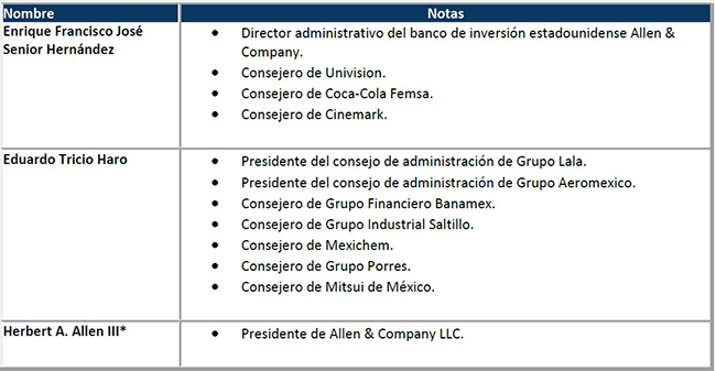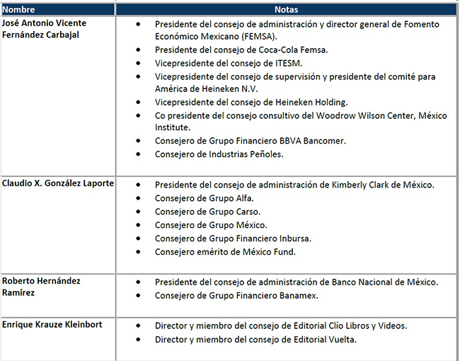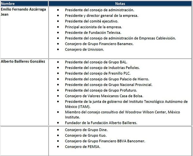 En el siguiente cuadro, Francisco Vidal Bonifaz (2015) nos presenta una lista detallada de los consejos de administración en los que tienen presencia los consejeros del Grupo Televisa.