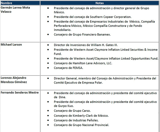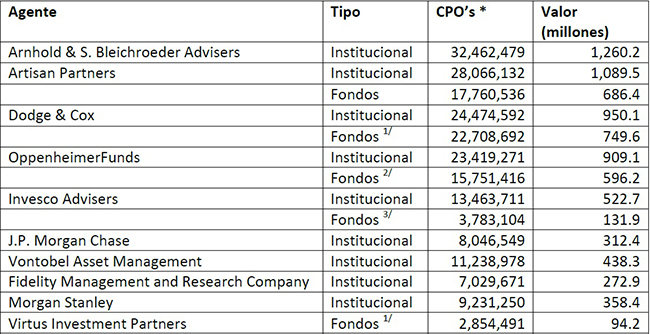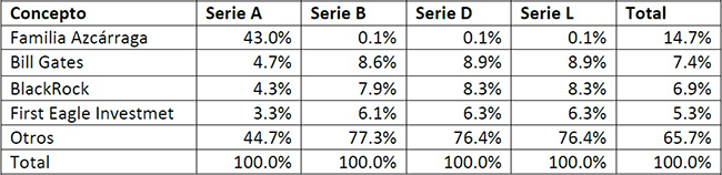 Además de Gates, BlackRock y First Eagle Investmet, existen otras varias instituciones financieras internacionales que poseen acciones de la empresa mexicana -ninguna rebasa el 5% del total del capital--, tanto como posición de inversión propia, como la que administran mediante fondos de inversión. Estas diversas posiciones se resumen en el cuadro # 3: