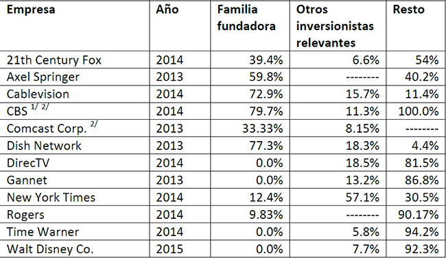 El grado de pulverización de la presencia de las familias fundadoras es variable, pero es un hecho que existe una tendencia hacia la presencia de varios grupos de accionistas al interior de las grandes empresas de medios.