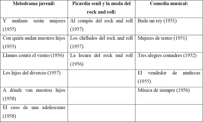 El cine mexicano de la época fue parte de ese movimiento de la emergencia del mundo juvenil y adolescente. De acuerdo con el crítico de cine Viñas (1987), entre 1951 y 1958 hubo un momento de transición del cine en México después de su glorioso periodo de oro, un momento de crisis en la creatividad y el impacto de sus propuestas a nivel nacional e internacional. Para Viñas hubo tres áreas temáticas que tendrían un vínculo con lo juvenil y con la música de rock, una visión cercana a las inquietudes despertadas por Rebelde sin Causa (1955), en donde se plasmaba la problemática de jóvenes que se rebelaban al patrón de vida de los adultos al mostrar a unos jóvenes desadaptados socialmente o con tendencias a la delincuencia juvenil: el melodrama juvenil, derivado y en relación con el melodrama pasional y familiar; la picardía senil de la comedia donde músicos maduros se encuentran con el rock and roll como una moda del momento, y la comedia musical.