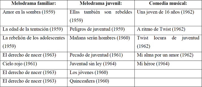 Si tomamos la periodización junto con la clasificación de las áreas temáticas del cine mexicano con problemáticas juveniles que propone Viñas (1987), y lo complementamos con lo esbozado por Ayala (1993), se puede tener una imagen de algunas de las películas presentes en el país.