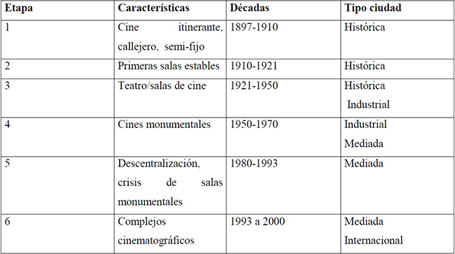 La vida en la ciudad tuvo un cambio importante al finalizar la década de los cincuenta y en los primeros años de los setenta, algo que coincide con el equipamiento de salas cinematográficas en esas décadas. En un esfuerzo de síntesis que se realizó para cartografiar las salas de cine en la ciudad de León desde principios hasta finales del siglo XX (Gómez, 2004a), y tomando en cuenta la propuesta de García (1997) para entender la evolución de las ciudades en el país durante el siglo pasado (Cruces, 2012), es posible esbozar las etapas del cine en la ciudad de León a lo largo del siglo XX de la siguiente manera: