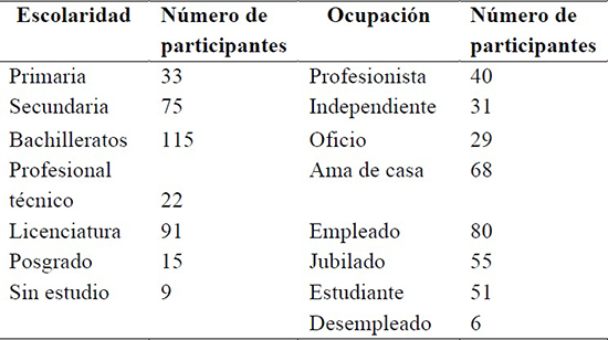 En total se aplicaron 360 instrumentos,2 distribuidos por rangos de edad en los sujetos participantes: 15-18 años (53 encuestados); 19-24 años (76 encuestados); 25-34 años (78 encuestados); 35-44 años (61 encuestados); 45-54 años (encuestados); 55 años o más (47 encuestados). La distribución por sexo fue 190 hombres y 170 mujeres. En la tabla siguiente se muestra información relacionada con escolaridad y ocupación de quienes participaron en este estudio.