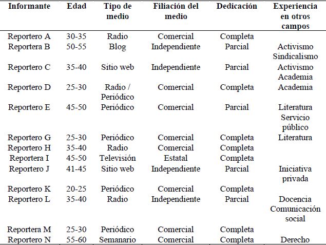 Los informantes fueron seleccionados con base en el criterio de conveniencia (Martínez-Salgado, 2012, p. 616) derivado de las posibilidades de acceso de la investigadora a través de sus redes socioprofesionales, conformando un conjunto de trece reporteros, cantidad delimitada por medio del criterio de saturación (p. 617) y que, como dejan ver los datos de la tabla 1, constituye una muestra estructural, en tanto representa a una variedad considerable de edades, trayectorias y tipos de medios de comunicación que componen al campo.