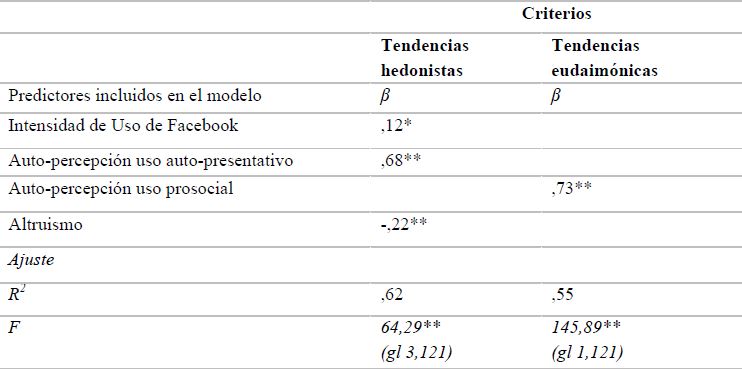 Se efectuó un análisis de regresión lineal recurriendo al método stepwise [paso a paso], con el fin de determinar los posibles predictores de las tendencias de uso en estudio (ver tabla 1). Se encontró que las tendencias de uso hedonistas se asocian positivamente con la intensidad de uso de Facebook (β .12, p < .05) y la auto-evaluación del uso auto-presentativo (β .68, p < .0001), y negativamente con el altruismo (β -.22, p < .0001). Por su parte, las tendencias de uso eudaimónico se relacionan de forma positiva con la auto-evaluación del uso prosocial (β .73, p < .0001) . Estos resultados indican que un uso más intensivo de Facebook se asocia con una mayor presencia de tendencias hedonistas de esta red social. Así mismo, el predominio de dichas tendencias hedonistas se predice por una mayor auto-percepción de uso auto-presentativo, pero por puntajes bajos en altruismo. En lo que respecta al predominio de las tendencias eudaimónicas va a ser predicho por puntuaciones altas en la auto-percepción de uso prosocial.