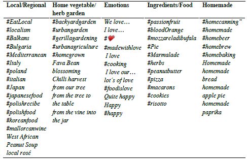 The sensory appreciation of meals and ingredients is linked with the quality of materials, but as well with the freshness of ingredients and seasonality. Consumers share pictures and information about meals and ingredients, but as well about their smells and flavors (e.g. #spicy, yummi, delicious, tasty, “so much flavor”, “tastes great”, smelling great, etc.). The seasonality (#eatwiththeseasons) is important and a home vegetable/herb garden is a source of fresh, clean and organic raw materials and a matter of pride and positive emotions which allow them to eat fresh ingredients from every season. For this reason, many tweets about fresh ingredients in many cases grown by themselves were shared (Table 2).