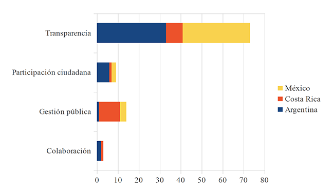 Se observa un énfasis en los compromisos de transparencia, se trata de propuestas que buscan generar dispositivos para recolectar, sistematizar la información y luego ponerla a disposición de la ciudadanía. México y Argentina presentan una mayoría de compromisos en transparencia, mientras que Costa Rica tiene tantos compromisos en transparencia como en gestión pública.