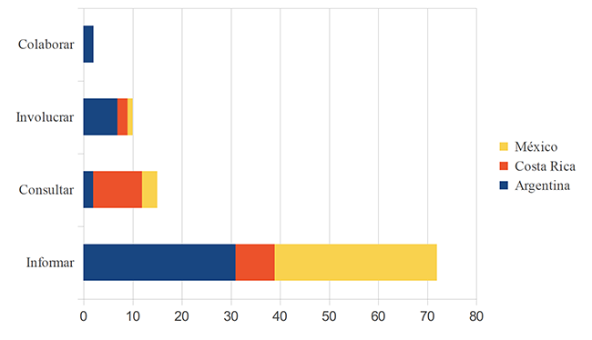 En conclusión, predomina un nivel de participación informativo. En los compromisos de mayores niveles de participación hay iniciativas de apertura de espacios virtuales donde se pueden compartir necesidades y proyectos, y la utilización de las tecnologías para el monitoreo de políticas públicas y la creación de redes entre Estado y sociedad civil. Finalmente, se puede observar la ausencia del nivel de participación que implica la toma de decisiones, es decir que los compromisos de gobierno abierto no incluyen iniciativas como votaciones o procesos de deliberación vinculantes con el diseño y ejecución de políticas públicas.