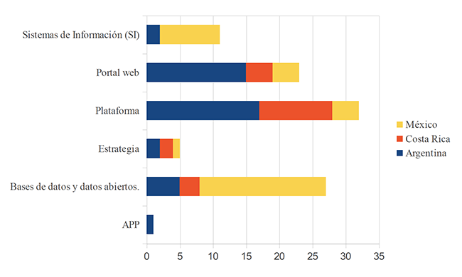 Por otra parte, los portales web, las estrategias o las plataformas tienen mayor presencia en Costa Rica y Argentina y remiten a compromisos que plantean tecnologías más participativas.