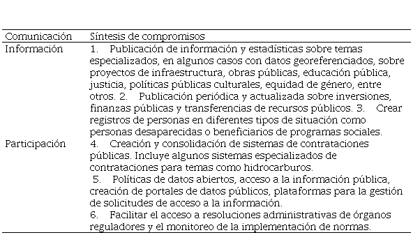 Los sistemas de información aparecen relacionados con los compromisos de transparencia, preocupados por dar cuenta de los procesos de contratación pública, obra pública y beneficiarios de políticas públicas.