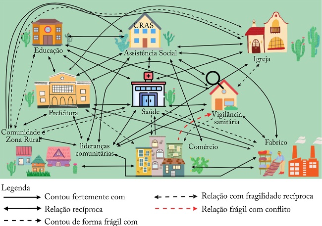 Observa-se na Fig. 1 que, embora haja relações frágeis e alguns conflitos, existe a predominância de vínculos fortalecidos e recíprocos. A rede de serviços e sociocomunitária do município de Camalaú apresentou-se como uma rede intersetorial, com vinculação predominantemente horizontalizada, permeada pela solidariedade, colaboração comunitária e com ações inspiradas no tripé: protocolos emitidos pelos órgãos sanitários e de saúde; recomendações cientificamente constatadas e divulgadas; e saberes locais e tradições sertanejas adaptados à necessidade de sobrevivência comunitária.