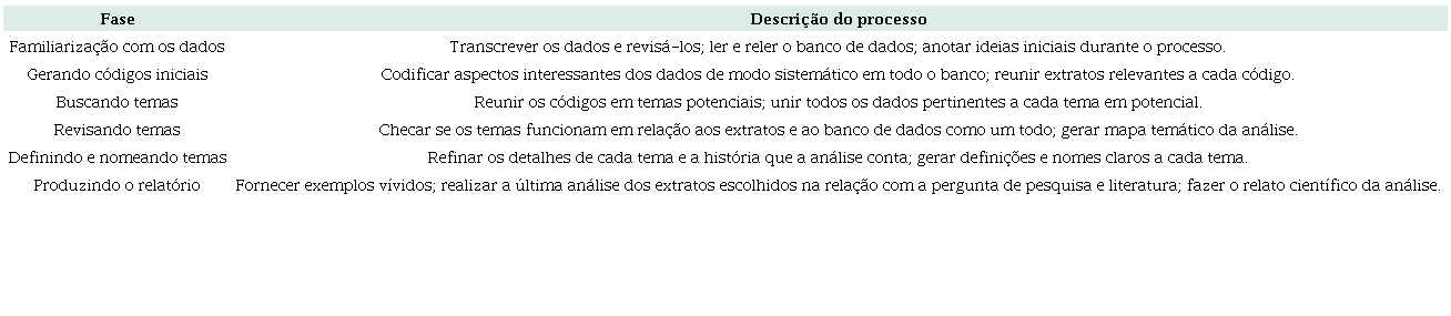 A análise temática é caracterizada por uma codificação fluída e flexível, em que os códigos podem evoluir e se modificar ao longo do processo. A análise objetiva a profundidade do envolvimento interpretativo (Conceição, 2021), em etapas recursivas que consistem na familiarização com os dados, produção de códigos, construção e revisão de temas. O paradigma interpretativo pressupõe um contínuo exercício de reflexividade e posicionalidade em estreito diálogo com a produção acadêmica. Coadunando com esse aspecto, tem-se a socionomia (Moreno, 1946/1997; 1953/1992) e a teoria de redes (Milanese, 2012; Rovere, 1999), em seu viés construtivista e coparticipativo, como via metodológica que permeia a pesquisa da coleta e análise de dados. A Tabela 1 mostra de forma sistemática as fases para a realização da análise temática, as quais foram seguidas para a análise das entrevistas e apresentação dos resultados da pesquisa.
