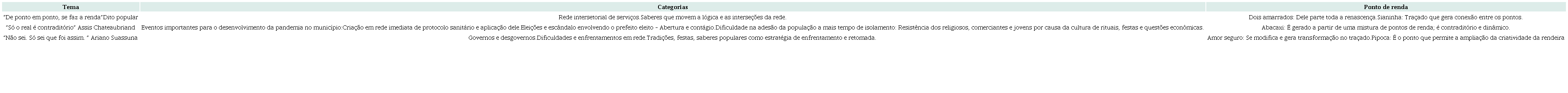 Assim, em um olhar externo, ouvimos histórias de vários fatos contraditórios que vão formando vínculos de relação entre as pessoas. Nessa lógica complexa, tecendo a narrativa como uma renda, podemos nos referir a esse tema como um ponto abacaxi (Tabela 2), o qual é gerado a partir de uma mistura de pontos de renda, trazendo algo como um emaranhado dinâmico que vai tomando forma com o tempo. Nesse contexto, a princípio, o município enfrentou uma sucessão de acontecimentos que marcam seu fechamento antes que a pandemia se alastrasse em toda cidade; nesse mesmo movimento, houve o cancelamento de festas. Agindo contra essas ações preventivas, surgiram ações negacionistas do ex-prefeito que não seguiu o protocolo sanitário criado pela rede para o enfrentamento do contexto pandêmico. Além disso, houve a resistência ao distanciamento social por parte de alguns religiosos, comerciantes e jovens por causa da cultura de rituais, festas e questões econômicas em oposição a um novo governo municipal que retomou os protocolos, com decretos baseados nos que eram enviados pelo governo estadual e nas reuniões entre os secretários. Dentro desse emaranhado de fatos, a rede, especialmente de serviços — como educação, assistência social, saúde, vigilância sanitária, prefeitura e sociedade civil —, uniu-se em ações sociocomunitárias e se movimentou a favor do distanciamento, o que ocasionou diminuição no número de mortes e contágio no município. Com a chegada da vacina, a rede intensificou várias ações de atendimento à população. O discurso era de renascimento graças à vacina e, aos poucos, foram retomando algumas rotinas, entre tropeços e acertos, crença e descrença, na tentativa de sobreviver.