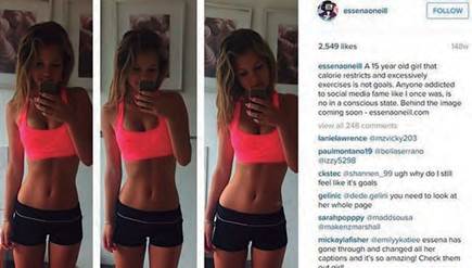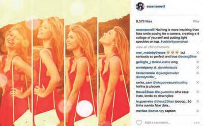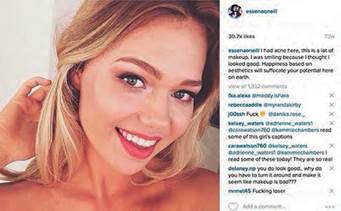Sin embargo, a pesar de lo maravillosa que es la fotografía, la modelo revela: "Nada es más inspirador que una falsa sonrisa posando para una cámara, creando un collage de ti misma y colocando luces brillantes por encima" (O´Neill, 2015). Todo lo que creíamos al ver de la foto resultó ser una mentira. Una mentira que O´Neill construyó, maquilló, produjo y presentó para sus seguidores. Así como en un show, utilizó “luces” para resaltar su personaje. Había pasado su vida al mundo virtual, un medio en el que la construcción de algo falso parece ser más fácil. De esta manera se abrió camino hacia un público más amplio, con el fin de satisfacer su creciente necesidad de exposición y aplauso. Sin embargo, ella expresa su adicción a las redes sociales y se retracta de su comportamiento al comprender lo solitaria y superficial que se había vuelto su vida. Pasé de los 12 hasta los 16 años deseando recibir la validación de los números en una pantalla. Pasé la mayoría de mi adolescencia absorta en mí misma y tratando desesperadamente de complacer a los demás. De los 16 a los 19 me autoedité para hacer ver que mi vida era hermosa, positiva y brillante. He decidido dejarlo, dejar los títulos educativos destinados a crear conciencia y quiero empezar algo importante (O´Neill, 2015).4