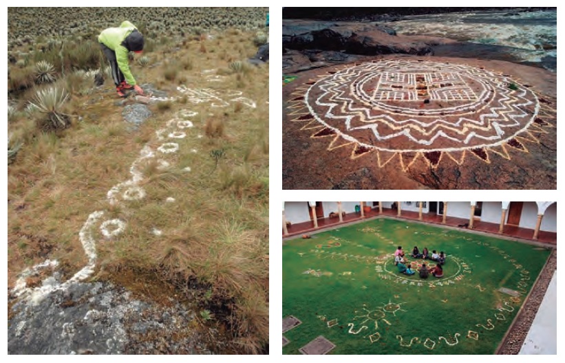 En algunas ocasiones Martín Roa utiliza la gráfica como parte de los rituales que actualmente lleva a cabo, de acuerdo a las condiciones de la “pinta” y el propósito específico de la acción que se debe ejecutar, informaciones que tienen que ver tanto con lo material como con lo espiritual. Para realizar este tipo de intervención se vale de elementos y productos naturales (harinas de cereales nativos, maíz, frutos, tubérculos, flores, plantas sagradas, esencias, miel, sal marina, concha de caracol, etc.), que aplica en lugares diversos, generalmente relacionados con su desempeño como portador de esta tradición indígena en el contexto urbano, así como en lugares de alto significado natural, de acuerdo con su actual vinculación con los Parques Naturales Nacionales de Colombia (Figuras 2-4).