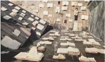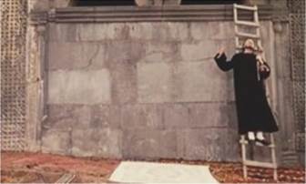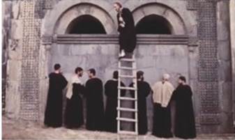 Sobre el tejado de un monasterio, varios libros empapados agitan sus páginas al viento abiertos de par en par. Un niño anda con cautela entre ellos, se tumba y abre los brazos adoptando una posición de cruz mientras las páginas crujen al secarse (Figura 1). Esta primera escena no deja lugar a dudas: Sayat Nova posee una fuerza estética y simbólica que nos abate desde el primer minuto del filme. Este carácter emblemático se dará en cada plano y cada escena a lo largo de toda la película.
