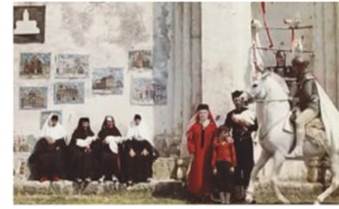 Un hombre recorre el plano de derecha a izquierda montado en su caballo blanco (Figura 11). En la escena aparecen otros tantos personajes estáticos, quietos. A la izquierda, un grupo de mujeres sentadas vestidas de negro; a la derecha, padre, madre e hijo. Tras ellos, un soldado se mantiene quieto en un hueco del muro con el cuerpo en forma de X, junto a varias gallinas que reposan en una serie de palos en paralelo de los que cuelgan trozos de tela roja. Cuando el hombre montado a caballo pasa, el niño va tras él saltando de una pierna a otra, imitando el trote del caballo. Las mujeres de negro, ríen.