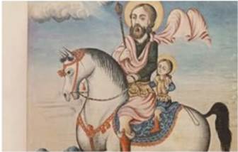 Si atendemos a los versos que recita la voz en off, deducimos que el hombre montado a caballo es en realidad San Jorge (Jorge de Capadocia). El santo, muy venerado en la cultura armenia, aparece también en los dibujos de los libros de las primeras escenas montado en su caballo blanco. El niño, ingenuo, va detrás de él imitándolo. Esta escena no es relevante solo por manifestar claramente ese choque entre el modernismo de la libertad del niño y la tradicionalidad cultural. El panorama que San Jorge presencia cuando pasa con su caballo es estático; los personajes se mantienen quietos y fríos. Cuando el caballo entra el plano, el niño se convierte, una vez más, en el motivo central del retablo.