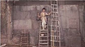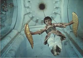 Existen multitud de ejemplos a lo largo del filme, pero hay una secuencia en que el balanceo adquiere una fuerza impactante. Pasemos a analizarla. Se trata de un presagio de la muerte del poeta, el paso a su etapa final. Primero vemos al poeta adulto bajar unas escaleras de madera con el kamanche en la mano (Figura 14). En el siguiente plano aparece tumbado, mirando hacia arriba, impasible. Gira lentamente la cabeza hacia cámara y mantiene la mirada directa al espectador (Figura 15). En el contraplano, lo que interpretamos fácilmente como aquello que ve el poeta, vemos al niño bajando la misma escalera con un kamanche en la mano. Mientras baja, tras la escalera una bola dorada se balancea de un lado a otro (Figura 16). Se acerca la muerte del poeta, que observa sereno su devenir.