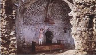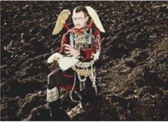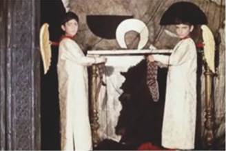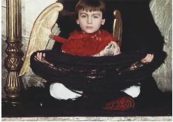 En las últimas etapas de la vida del poeta, el niño se nos presenta con frecuencia como un ángel (Figura 18). A lo largo de la película distinguimos dos figuras angelicales interpretadas por diferentes actores. El ángel inocente, infantil, vestido de blanco y portando alas doradas, interpretado siempre por niños (Figura 19) y personificado especialmente en el poeta de niño. Por otra parte, encontramos el ángel adulto, ciego, con ropas oscuras y una ofrenda cubierta con una tela (Figura 20).